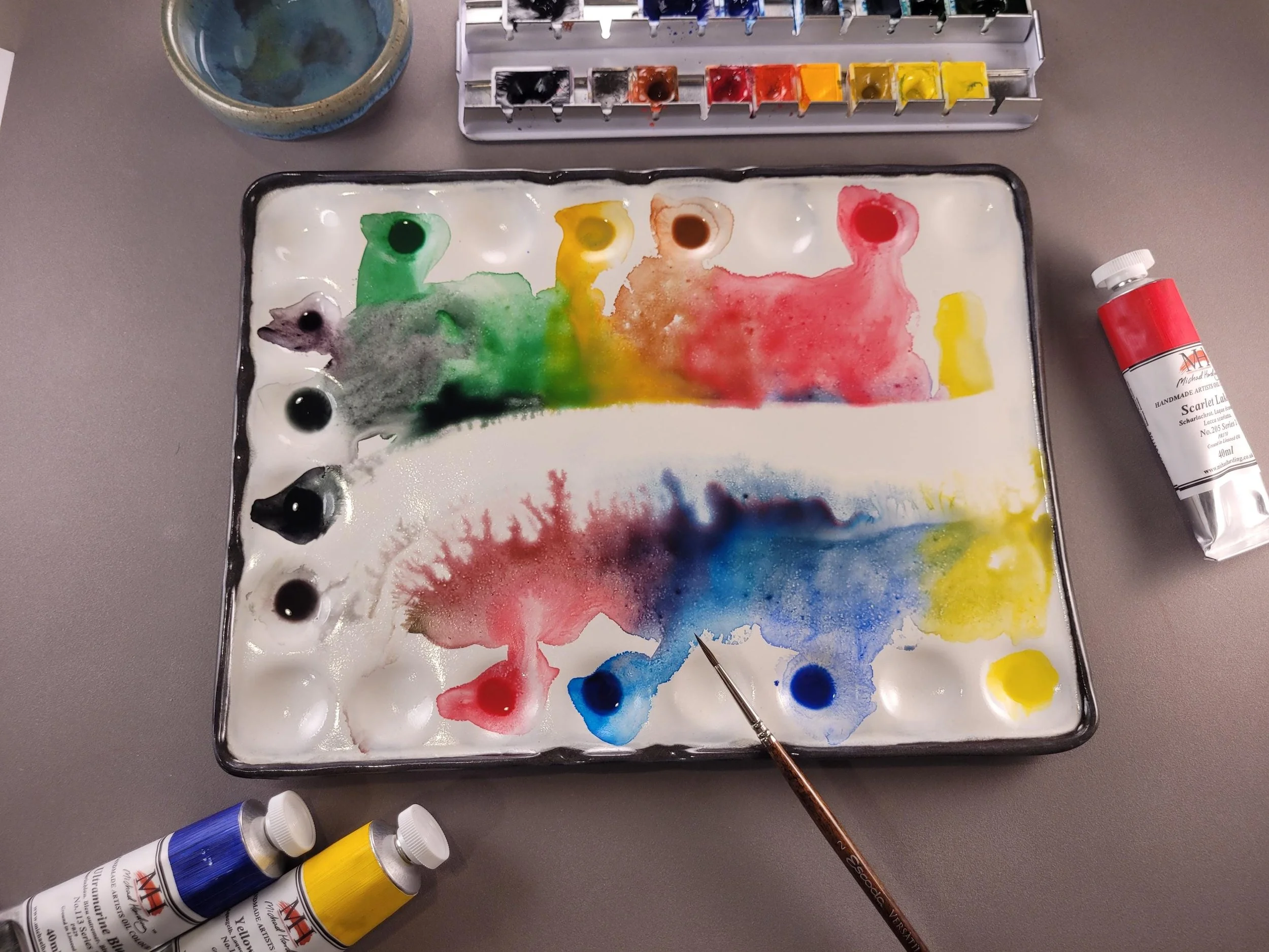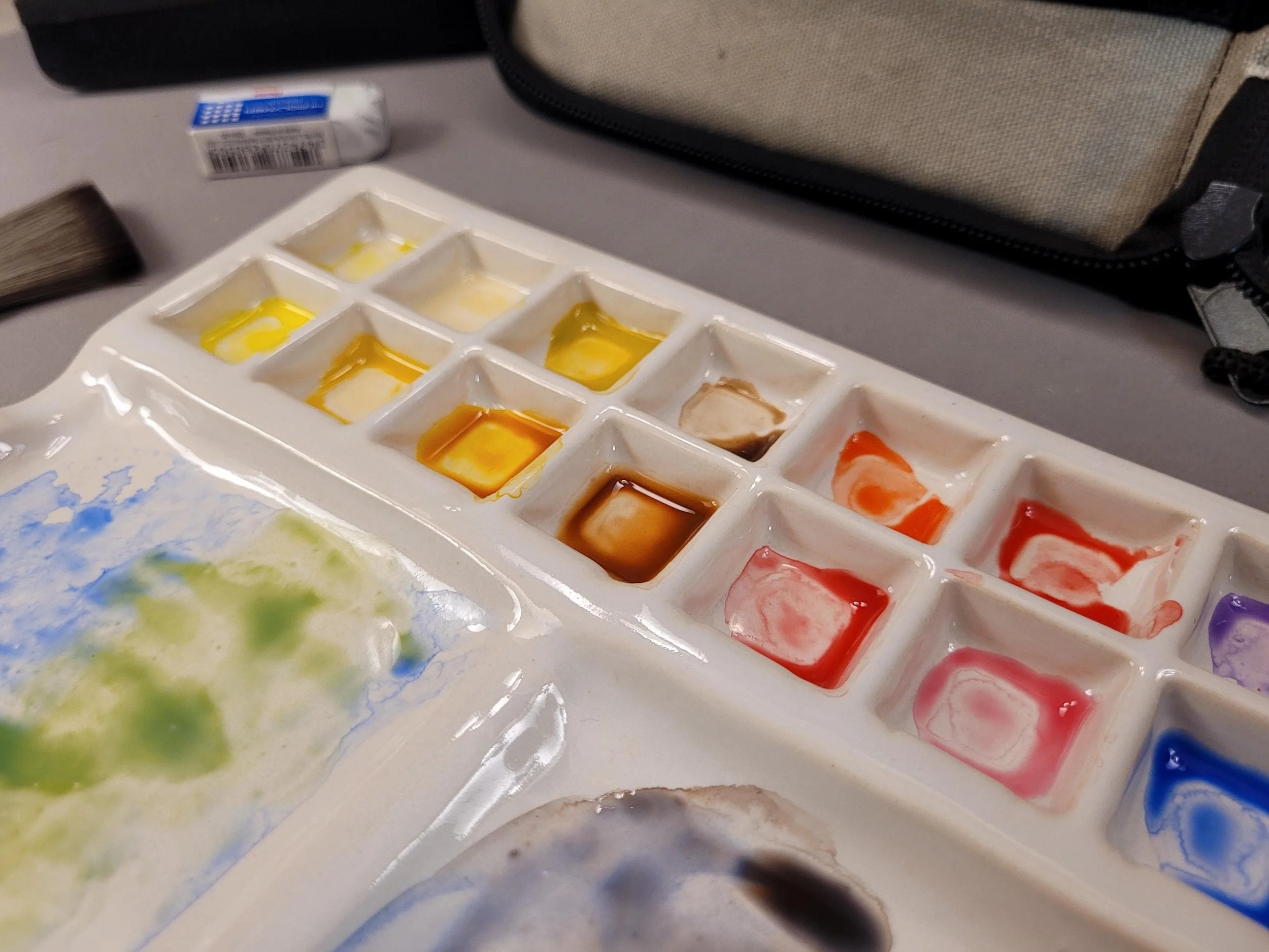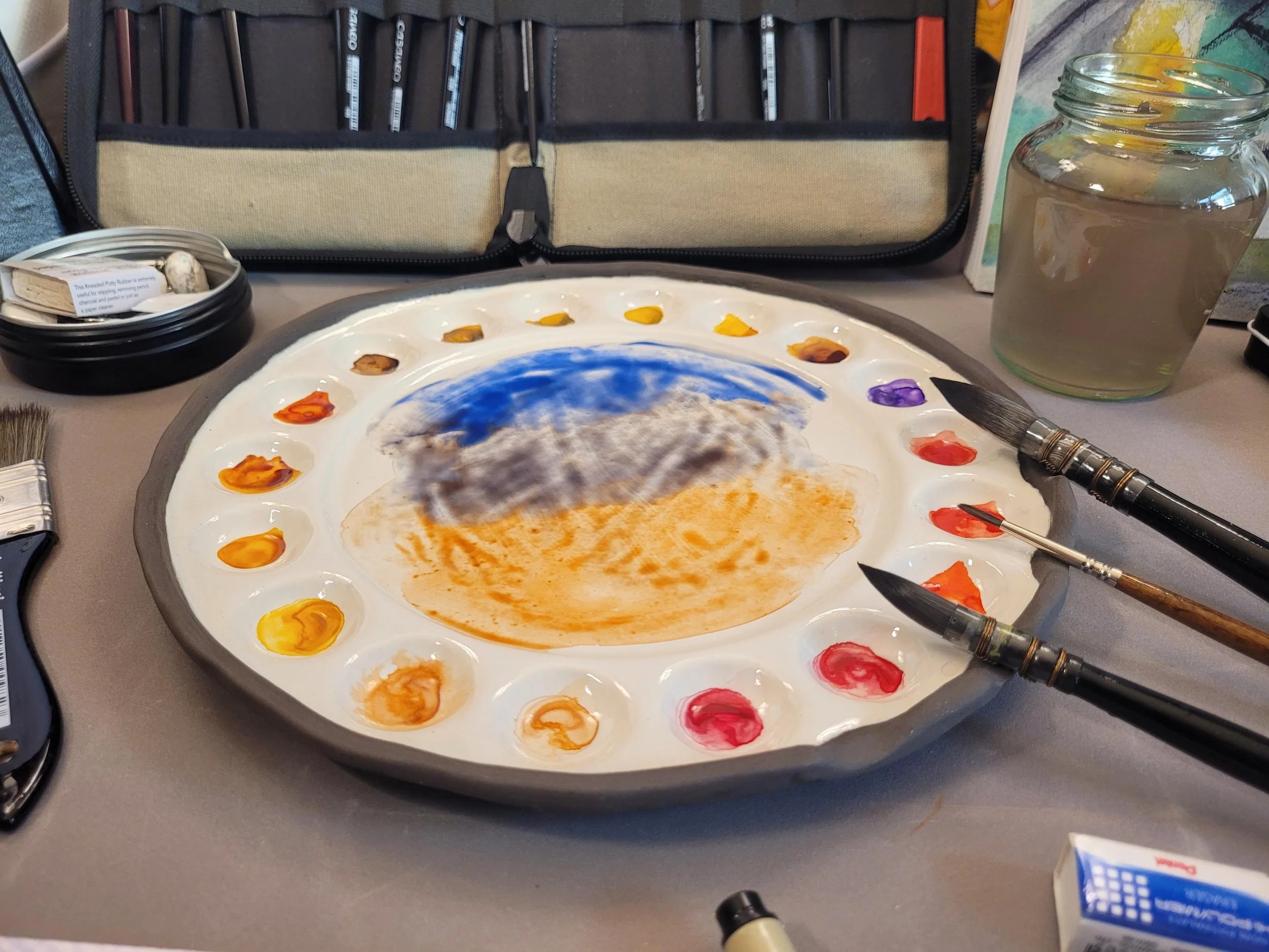 A variety of colorful soft pastels arranged in rows on a display table, organized by color in a rainbow pattern from green to blue, purple, pink, red, orange, yellow, and gray.